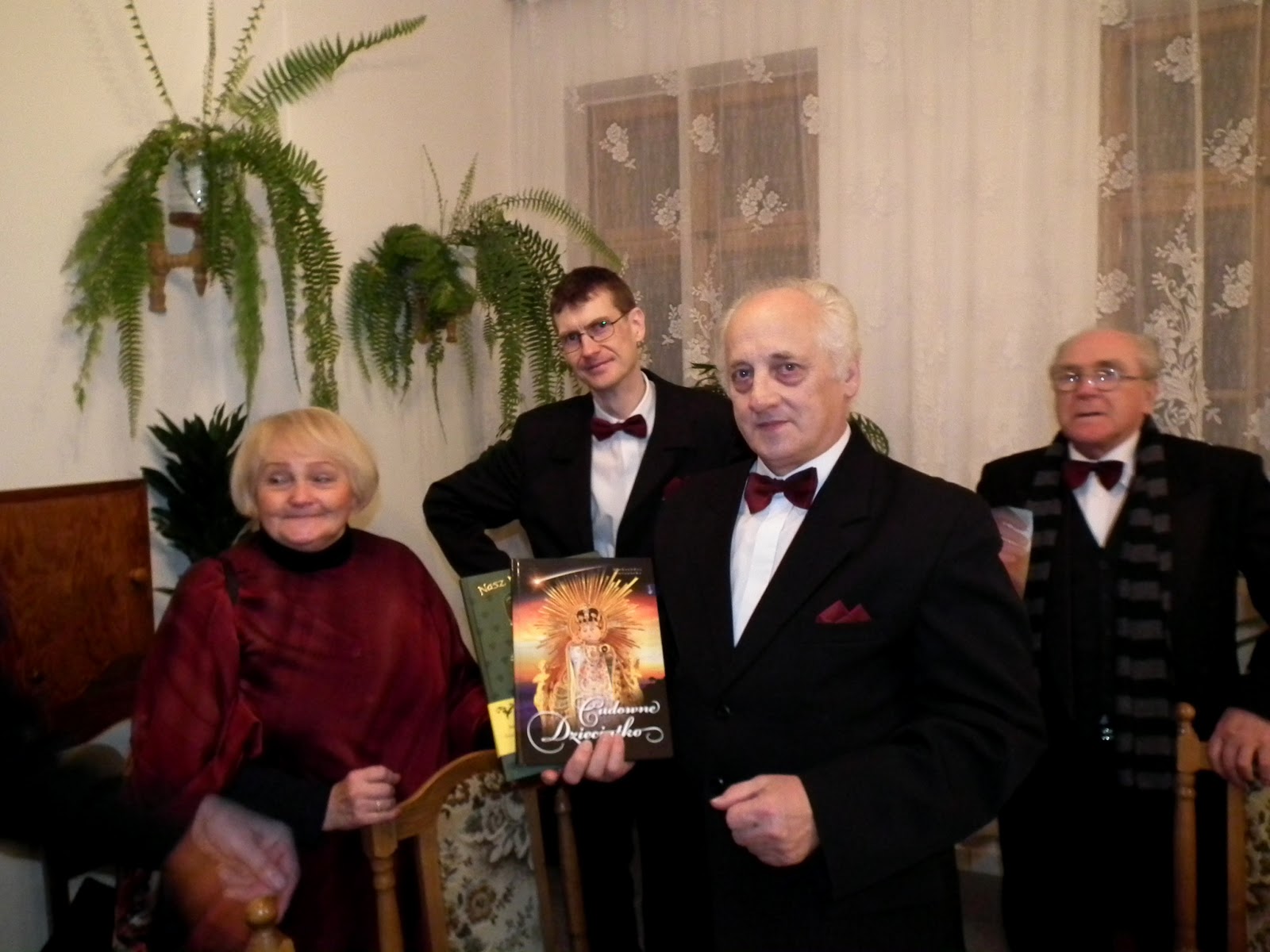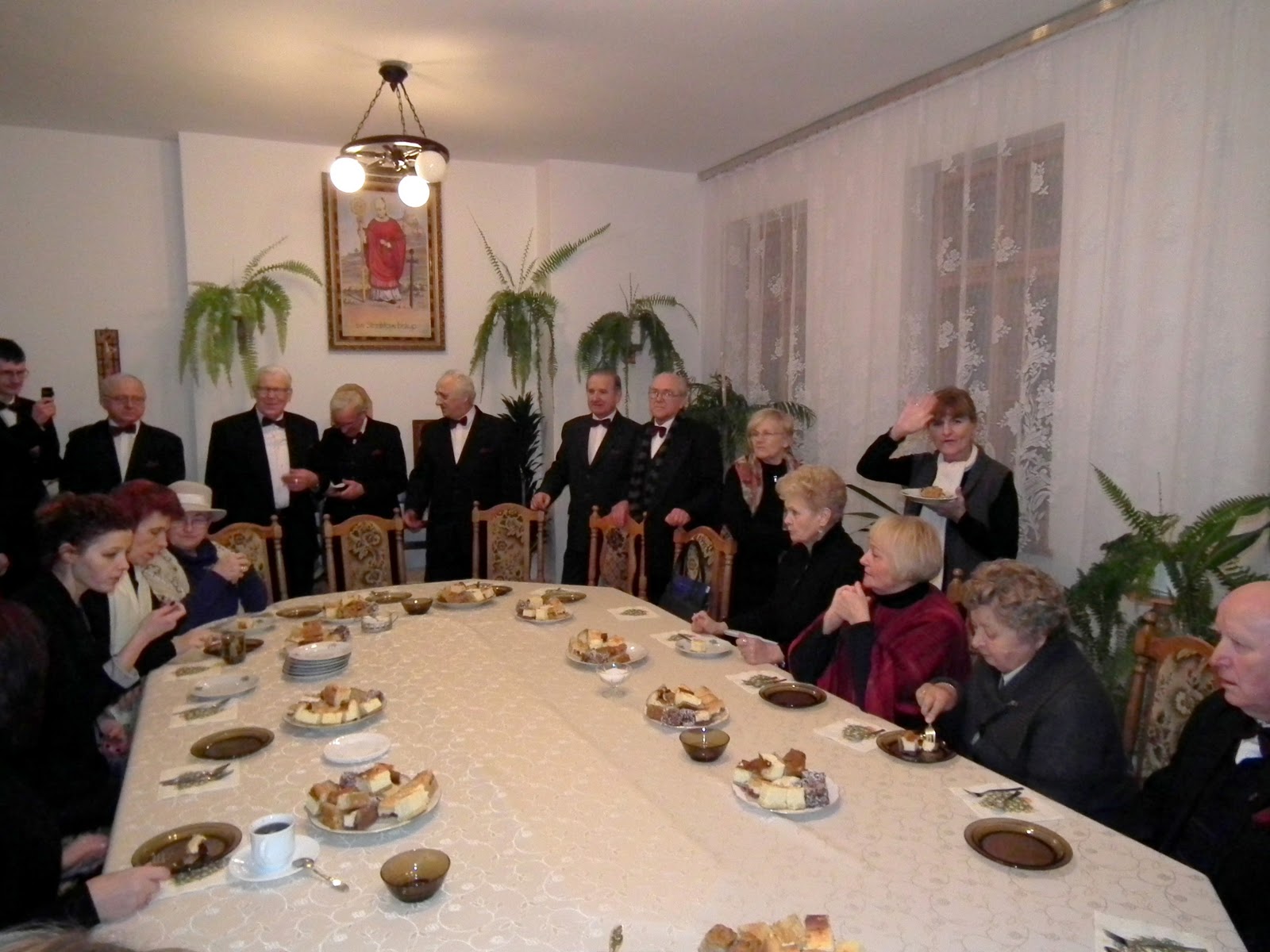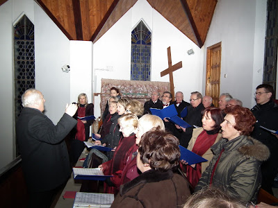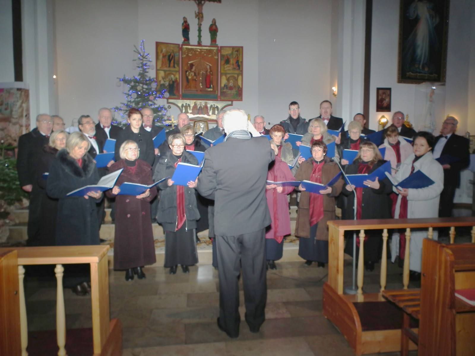 Po krótkiej podróży  wysiedliśmy zadowoleni, gdyż deszcz został za nami. Nasz kolega bas – Zdzisław Kucaj, który jest organistą w tut. parafii wskazał nam drogę na chór, gdzie śpiewaliśmy podczas mszy św. Po mszy chór ustawił się przed ołtarzem i wierni wraz z księdzem Proboszczem wysłuchali koncertu. Stasia Krzyśków jak co roku, przygotowała piękne słowo wiążące. Po koncercie zostaliśmy zaproszeni na ciasto i kawę.
