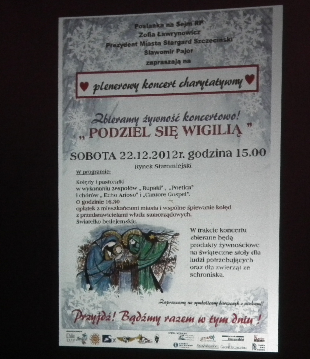 W mroźne, sobotnie popołudnie przybyliśmy na stargardzki Rynek Staromiejski na prośbę Pani Zofii Ławrynowicz. Posłanka na Sejm RP Zofia Ławrynowicz oraz Prezydenta Miasta Stargard Szczeciński Sławomir Pajor byli organizatorami koncertu charytatywnego.